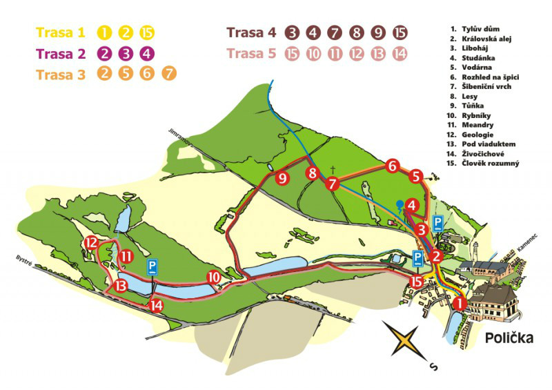 1. Tylův dům (P), 2. Královská alej (P), 15. Člověk rozumný - sídliště M. Bureše (P) - všechna stanoviště jsou v Poličce